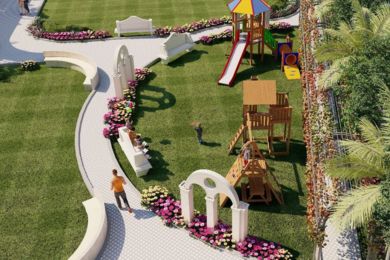 A lush green park with walking tracks, play areas, and peaceful seating spaces for relaxation, fitness, and family time.